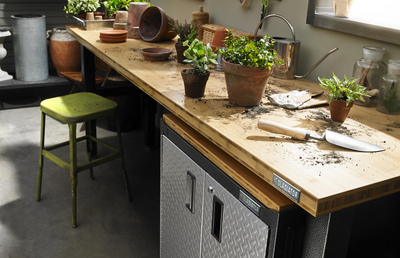 Solid hardwood top and steel leveling legs make it the perfect surface for projects from gardening to auto repair.
